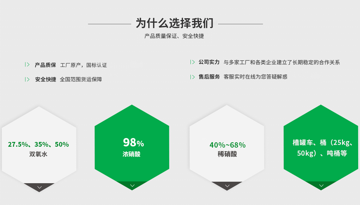 - 安徽安德諾化工產(chǎn)品銷(xiāo)售有限公司:位于合肥市蜀山區(qū),交通便利,主要經(jīng)營(yíng)雙氧水(27.5%、35%、50%)、濃硝酸(98%)、稀硝酸(40%~68%)等化工產(chǎn)品,與多家工廠和各類企業(yè)建立了長(zhǎng)期穩(wěn)定的合作關(guān)系。公司產(chǎn)品齊全,實(shí)力雄厚,重信用、守...